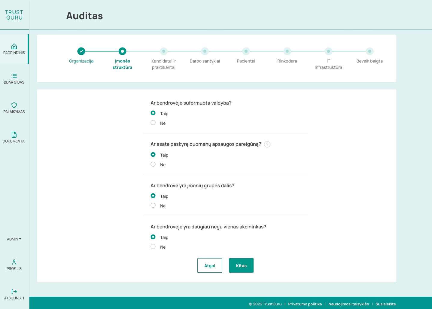 Skaitmeninio audito metu atsakysite į klausimus, pagal kuriuos sistema atrinks tik Jums reikiamas TrustGuru funkcijas ir pritaikys dokumentus.