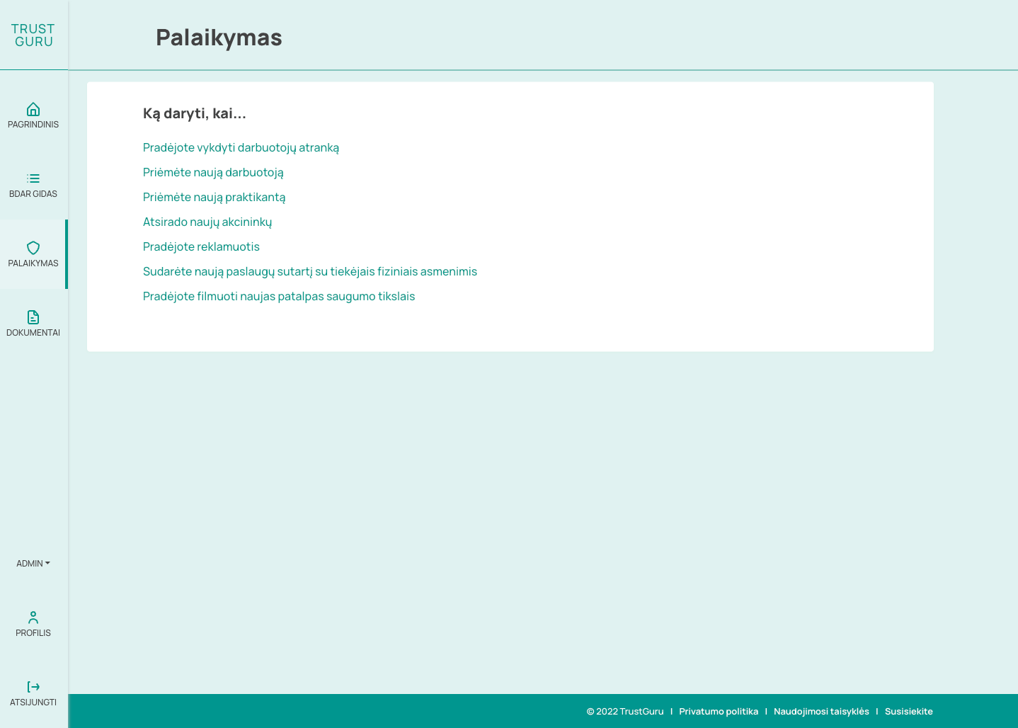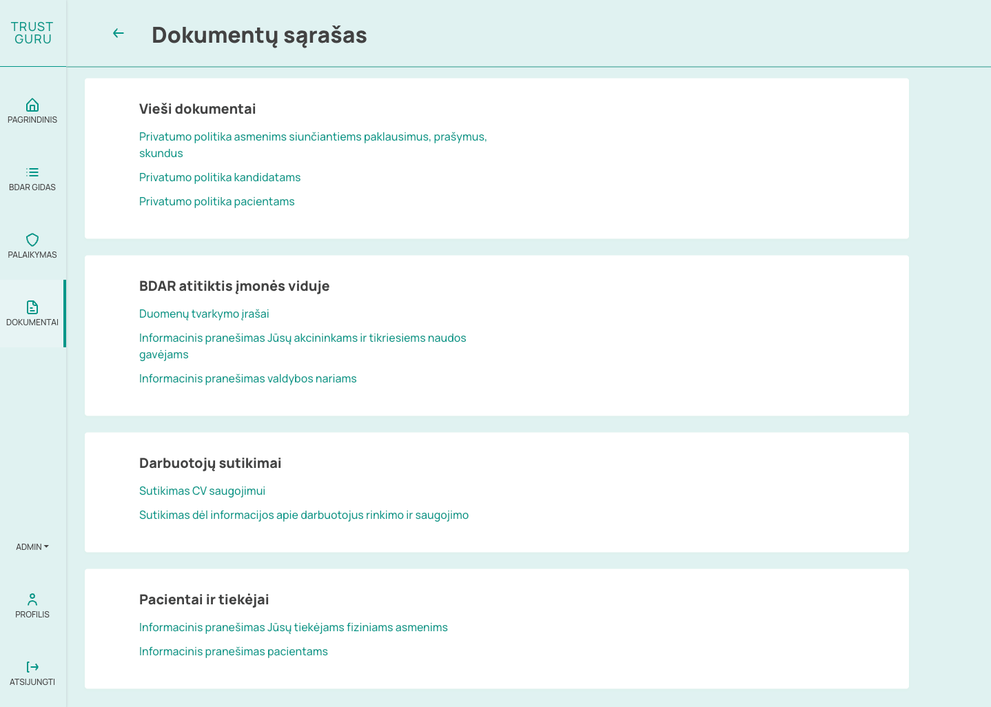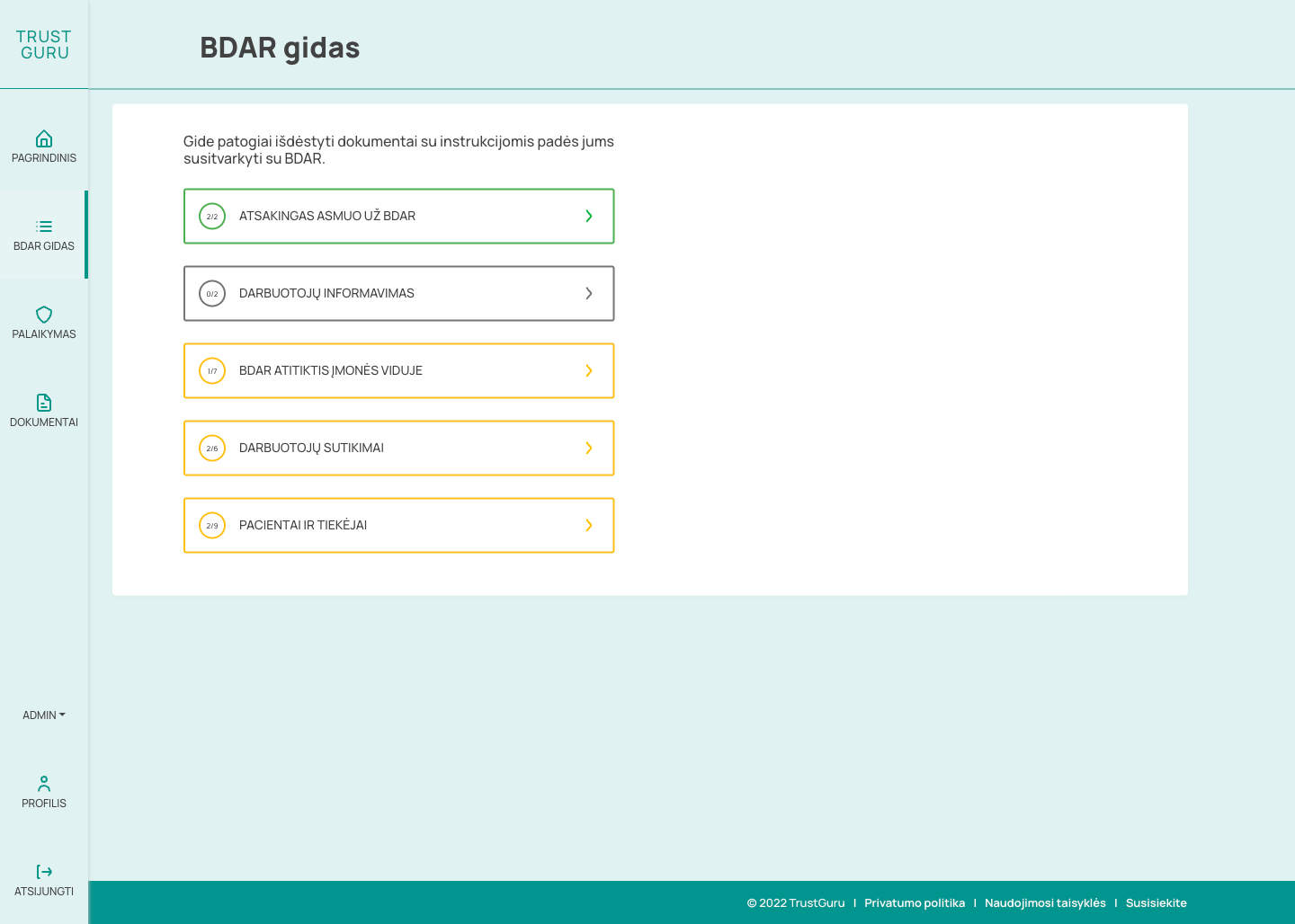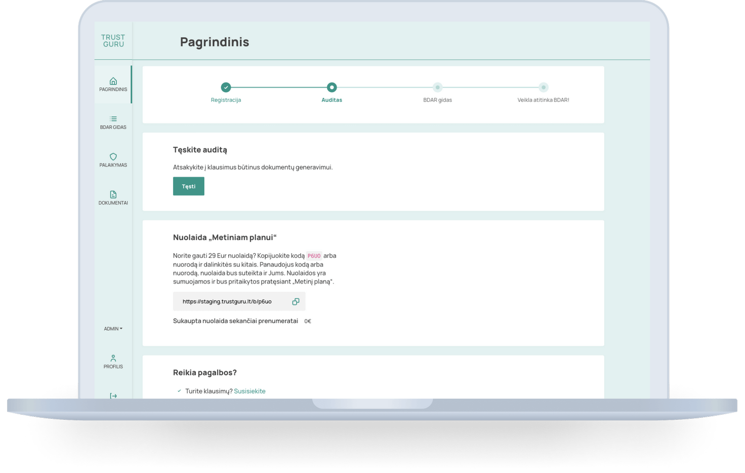 TrustGuru tai skaitmeninis bendrojo duomenų apsaugos reglamento (BDAR) atitikties sprendimas. Įrankis generuoja, pritaiko ir atnaujina dokumentus, mokymus ir nurodo reikiamus atlikti veiksmus.